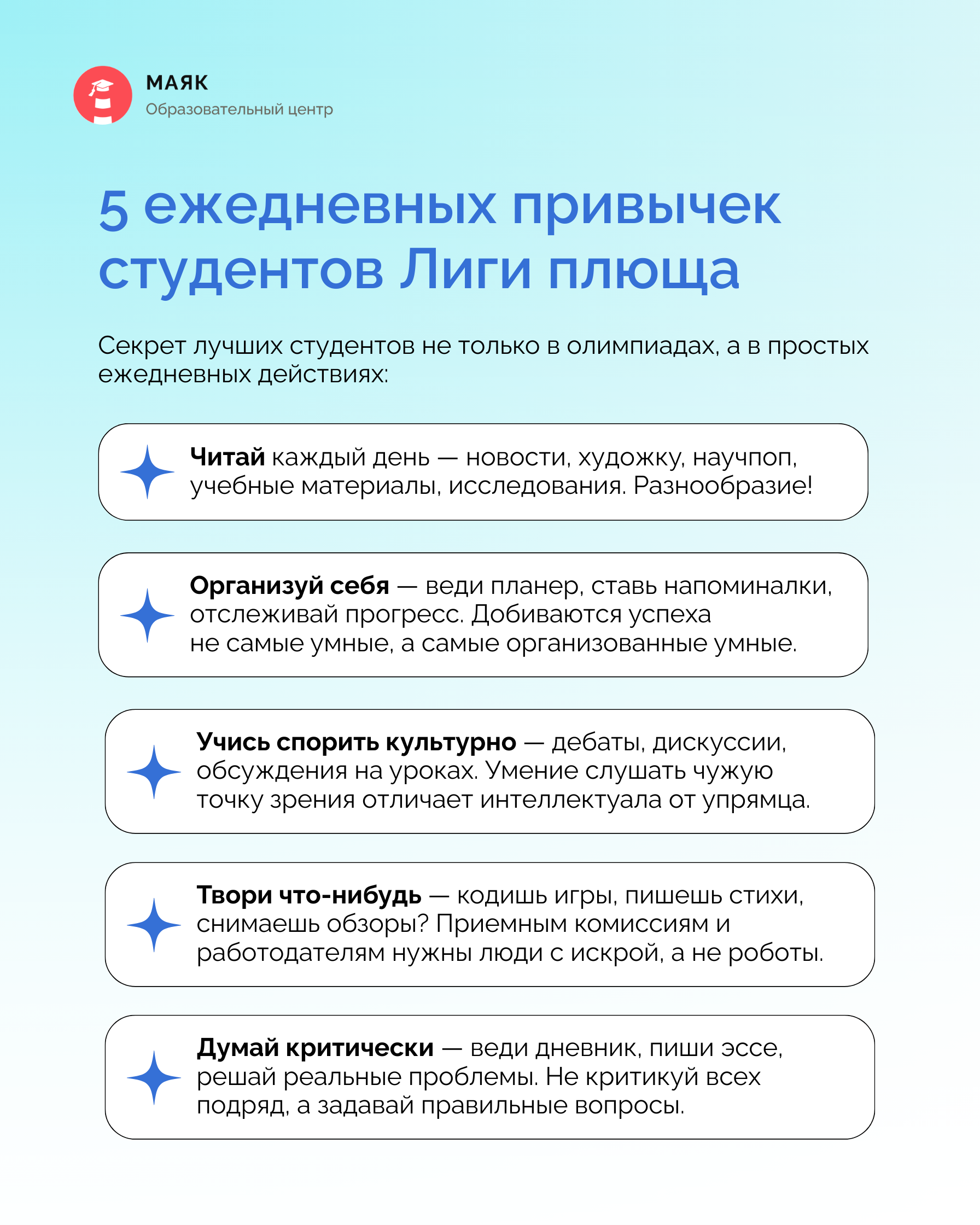 Начни с одной привычки, потом добавь вторую. И через год ты удивишься, насколько изменился твой уровень! А приемная комиссия удивится, откуда такой крутой абитуриент взялся 🧡
